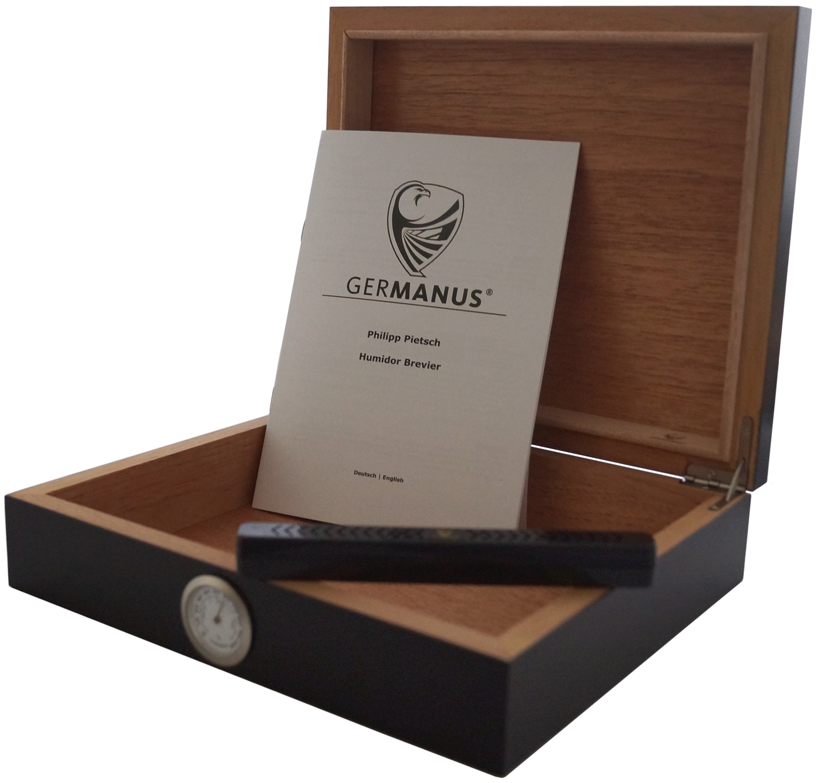 Geliefert wird dieser Zigarren-Humidor mit GERMANUS Kristall Befeuchter, analogem Hygrometer und GERMANUS Humidor Brevier.
